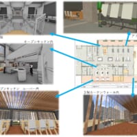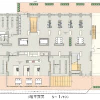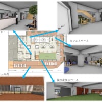 2階はカフェがメインとなる。2階のフロアレベルから600上がった屋内芝生スペースや西側には大きなカーテンウォールがある。カフェス部分、屋内芝生の部分、内部から外を見たパースです。