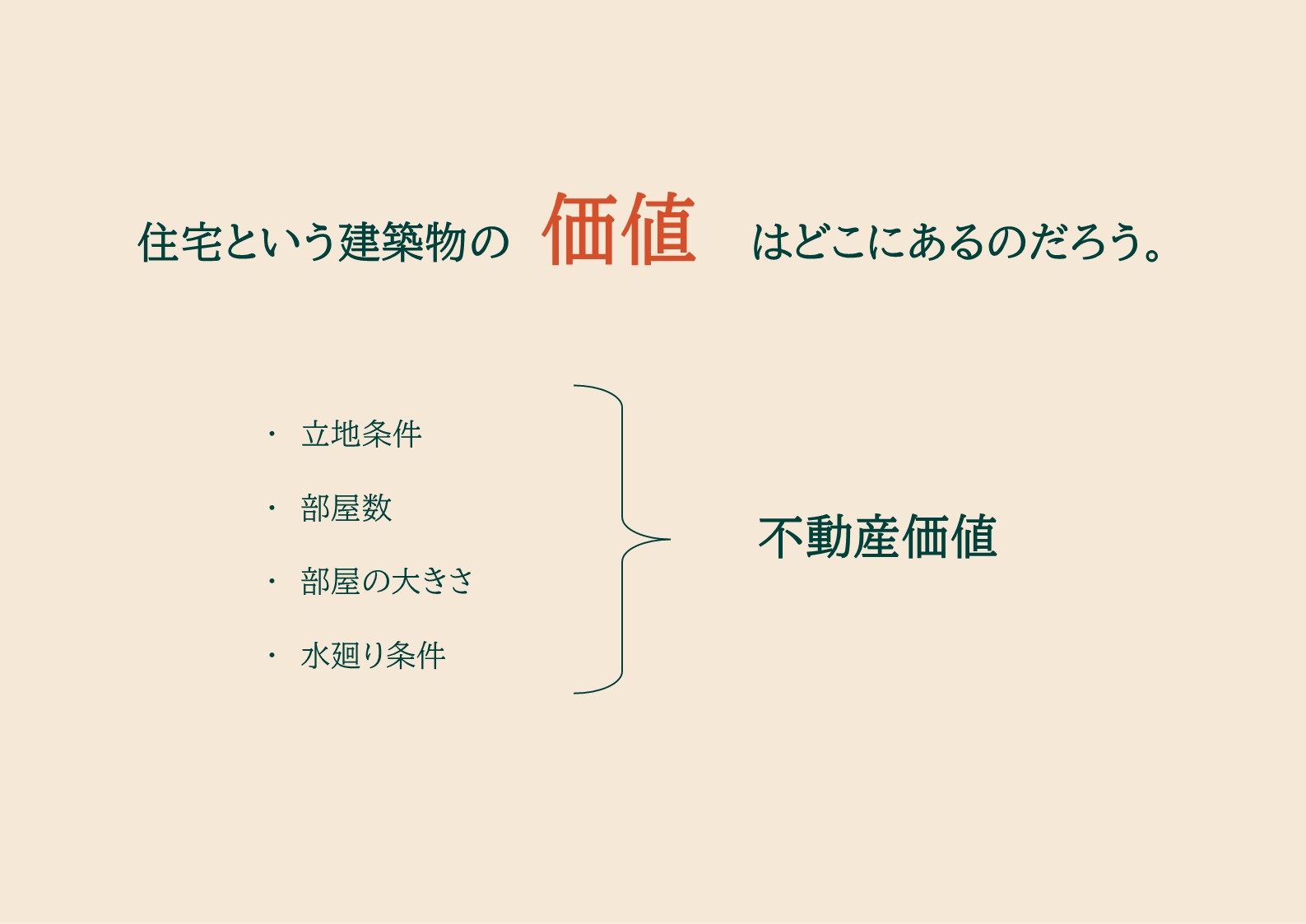 立地条件、部屋数、部屋の大きさ、水廻り条件。現在の一般的な住宅価値は