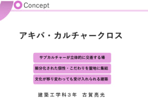 「アキバカルチャークロス」は、交差・集積・更新という都市の本質を空間化し、身体的な出会いと共鳴を生み出し続ける新たな都市の核となる提案である。